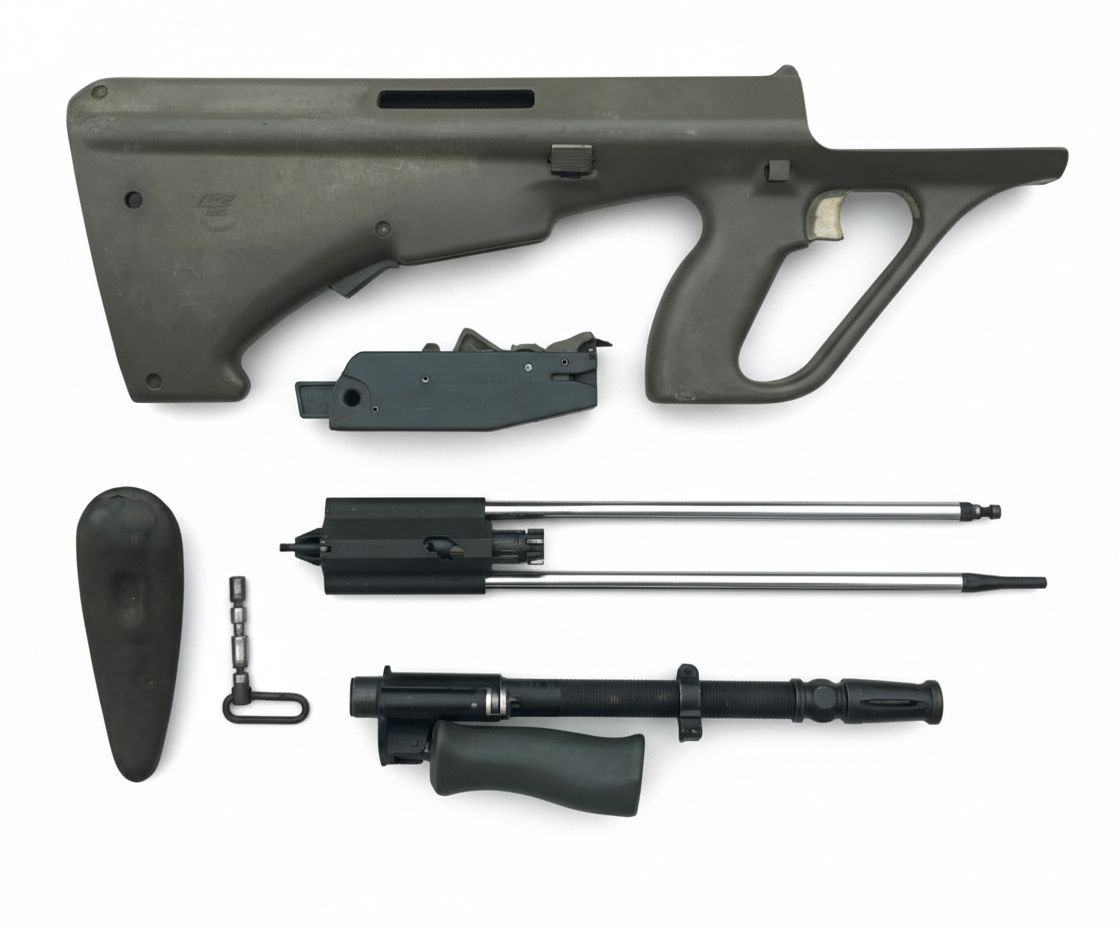 This AUG parts kit contains all surplus parts required to build your Nylaug. It comes with a complete right-hand stock, bolt carrier group, trigger pack, and gas port.