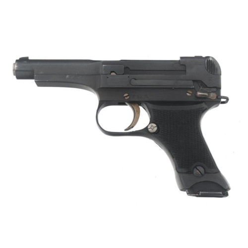 Chambered in 8x22mm Nambu, the Type 94 was a compact semi-automatic pistol with a 6-round detachable box magazine. It had a short-recoil, locked-breech design and was known for its lightweight, streamlined form. The frame and slide were made from blued steel, with grooved wooden grips attached by screws.